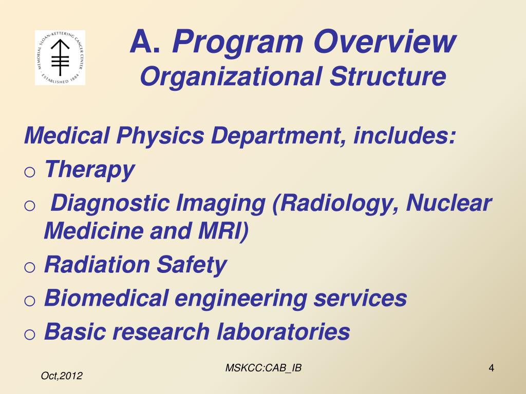 A. Program OverviewOrganizational Structure Medical Physics Department, includes: Therapy Diagnostic Imaging (Radiology, Nuclear Medicine and MRI) Radiation Safety Biomedical engineering services Basic research laboratories MSKCC:CAB_IB