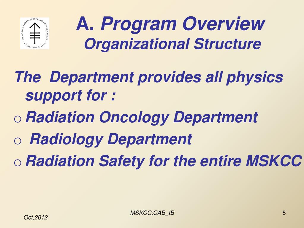A. Program Overview Organizational Structure The Department provides all physics support for : Radiation Oncology Department Radiology Department Radiation Safety for the entire MSKCC MSKCC:CAB_IB
