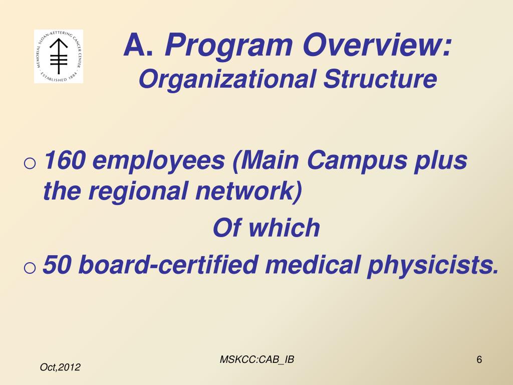 A. Program Overview:Organizational Structure 160 employees (Main Campus plus the regional network) Of which 50 board-certified medical physicists. MSKCC:CAB_IB
