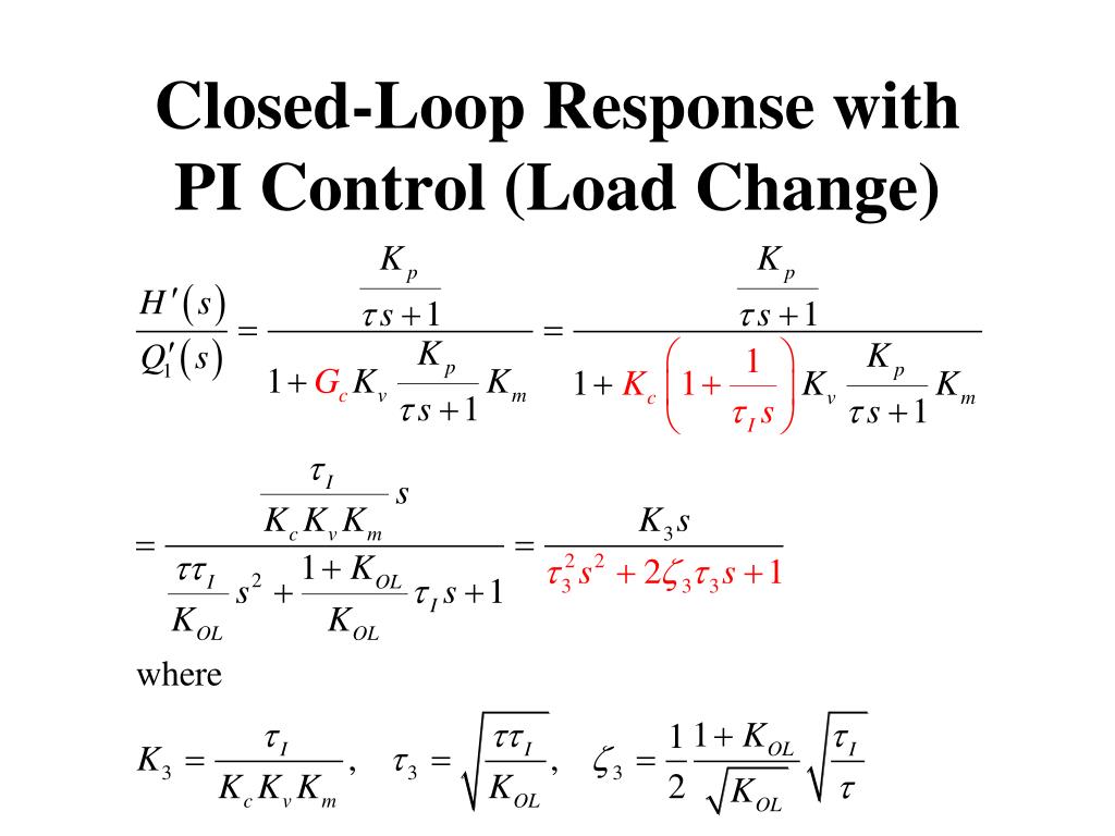 To place Eqn. (4) in the same form as the denominator of the T.F. in Eqn. (5), divide by Kc, KV, KM : Comparing coefficients (5) and (6) gives: Chapter 11 Substitute, For 0 < < 1 , closed-loop response is oscillatory. Thus decreased degree of oscillation by increasing Kc or I (for constant Kv, KM, and A). • unusual property of PI control of integrating system • better to use P only