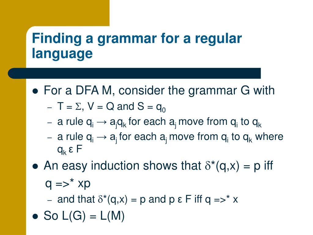 Finding a grammar for a regular language • For a DFA M, consider the grammar G with • T = S, V = Q and S = q0 • a rule qi → ajqk for each aj move from qi to qk • a rule qi → aj for each aj move from qi to qk where qk ε F • An easy induction shows that d*(q,x) = p iff q =>* xp • and that d*(q,x) = p and p ε F iff q =>* x • So L(G) = L(M)
