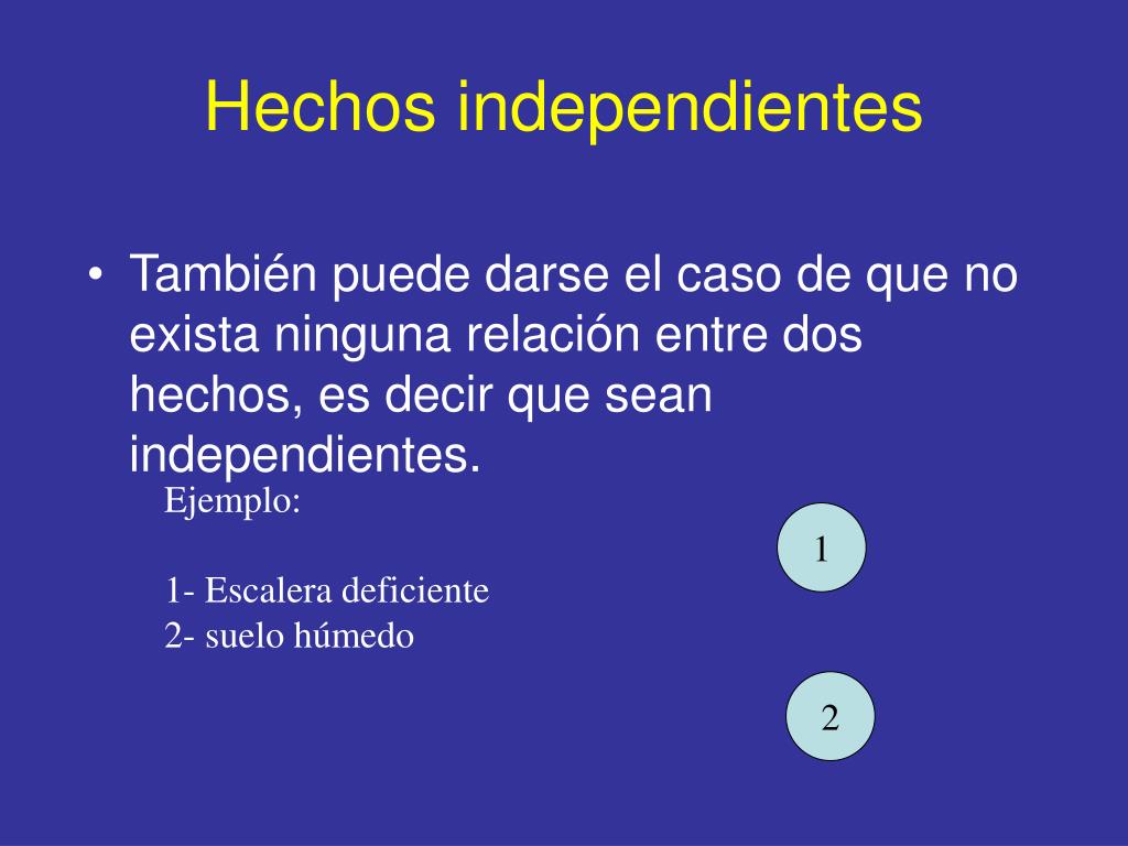 Hechos independientes • También puede darse el caso de que no exista ninguna relación entre dos hechos, es decir que sean independientes. Ejemplo: 1- Escalera deficiente 2- suelo húmedo 1 2