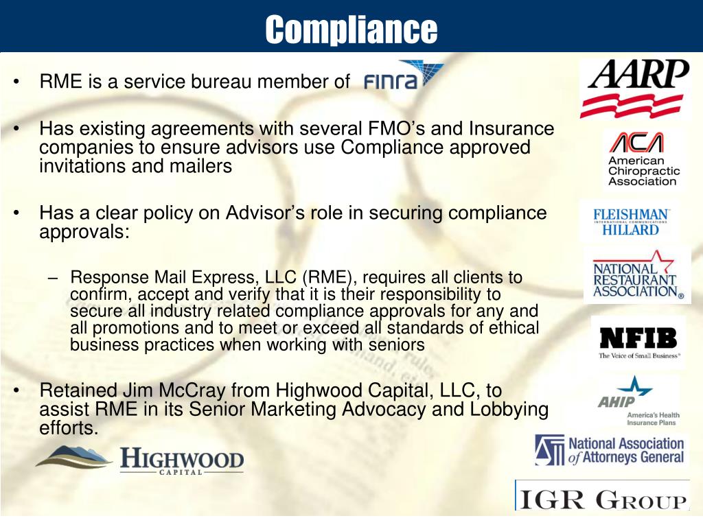 Compliance • RME is a service bureau member of • Has existing agreements with several FMO’s and Insurance companies to ensure advisors use Compliance approved invitations and mailers • Has a clear policy on Advisor’s role in securing compliance approvals: • Response Mail Express, LLC (RME), requires all clients to confirm, accept and verify that it is their responsibility to secure all industry related compliance approvals for any and all promotions and to meet or exceed all standards of ethical business practices when working with seniors • Retained Jim McCray from Highwood Capital, LLC, to assist RME in its Senior Marketing Advocacy and Lobbying efforts.