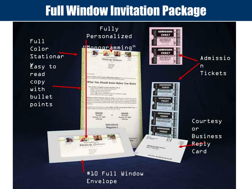 Full Window Invitation Package Fully Personalized “Monogramming” Full Color Stationary Admission Tickets Easy to read copy with bullet points Courtesy or Business Reply Card #10 Full Window Envelope