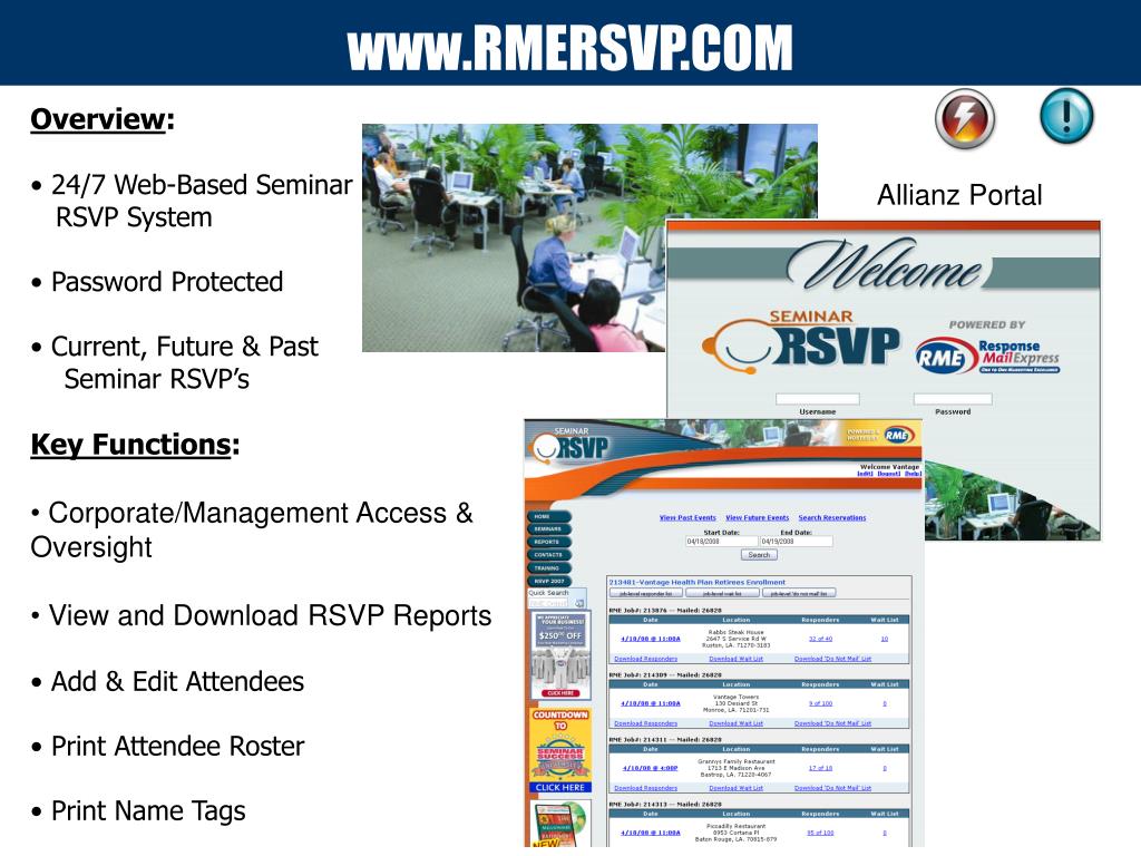 www.RMERSVP.COM • Overview: • 24/7 Web-Based Seminar • RSVP System • Password Protected • Current, Future & Past Seminar RSVP’s • Key Functions: • Corporate/Management Access & Oversight • View and Download RSVP Reports • Add & Edit Attendees • Print Attendee Roster • Print Name Tags Allianz Portal