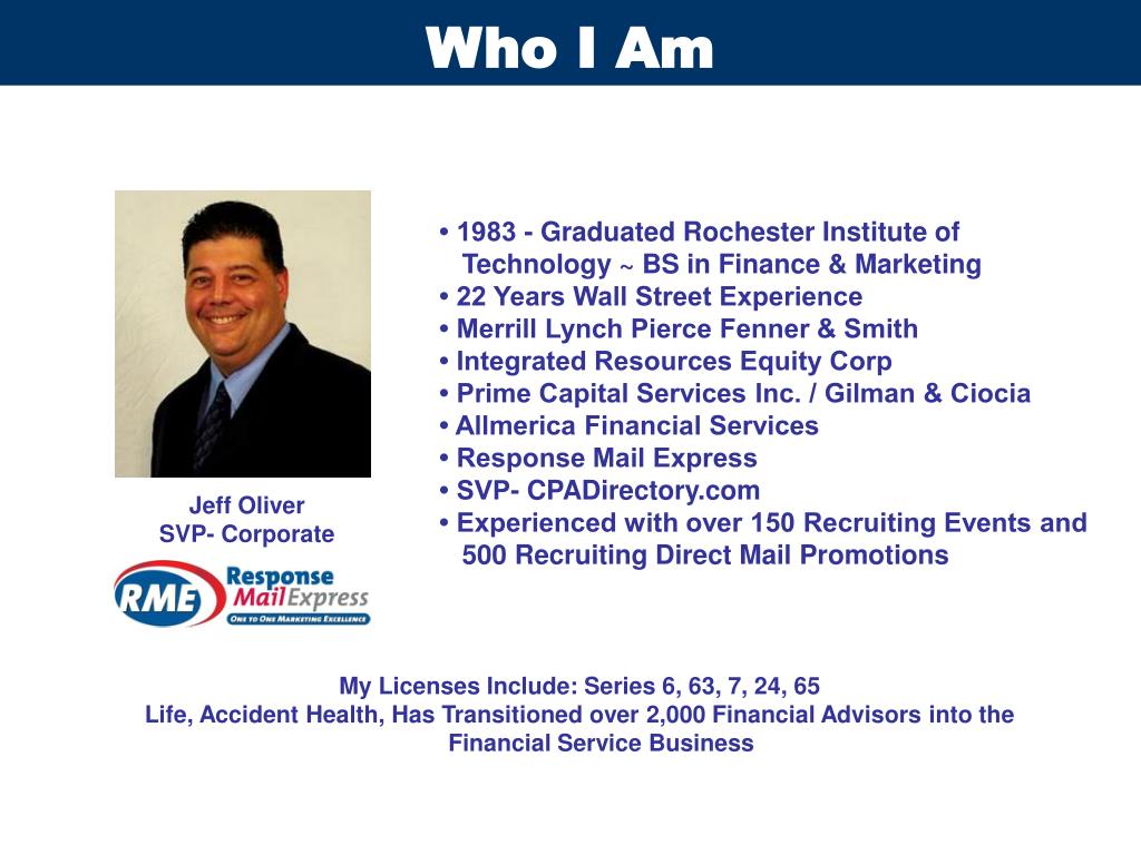 Who I Am • 1983 - Graduated Rochester Institute of Technology ~ BS in Finance & Marketing • 22 Years Wall Street Experience • Merrill Lynch Pierce Fenner & Smith • Integrated Resources Equity Corp • Prime Capital Services Inc. / Gilman & Ciocia • Allmerica Financial Services • Response Mail Express • SVP- CPADirectory.com • Experienced with over 150 Recruiting Events and 500 Recruiting Direct Mail Promotions Jeff Oliver SVP- Corporate My Licenses Include: Series 6, 63, 7, 24, 65 Life, Accident Health, Has Transitioned over 2,000 Financial Advisors into the Financial Service Business