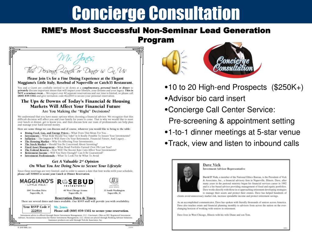 Concierge Consultation RME’s Most Successful Non-Seminar Lead Generation Program • 10 to 20 High-end Prospects ($250K+) • Advisor bio card insert • Concierge Call Center Service: Pre-screening & appointment setting • 1-to-1 dinner meetings at 5-star venue • Track, view and listen to inbound calls