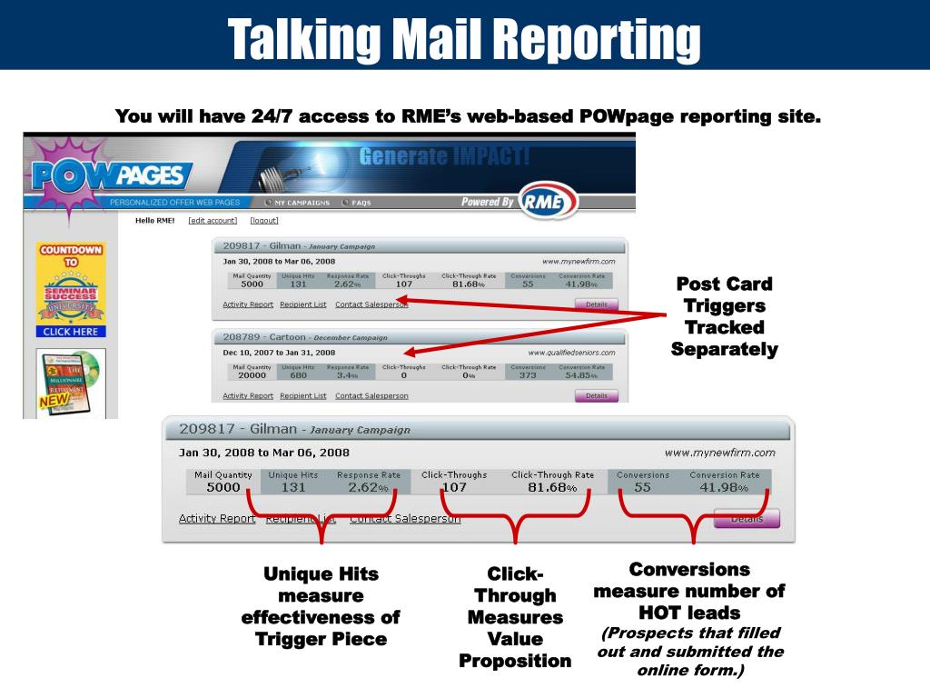Talking Mail Reporting You will have 24/7 access to RME’s web-based POWpage reporting site. Post Card Triggers Tracked Separately Conversions measure number of HOT leads (Prospects that filled out and submitted the online form.) Unique Hits measure effectiveness of Trigger Piece Click-Through Measures Value Proposition