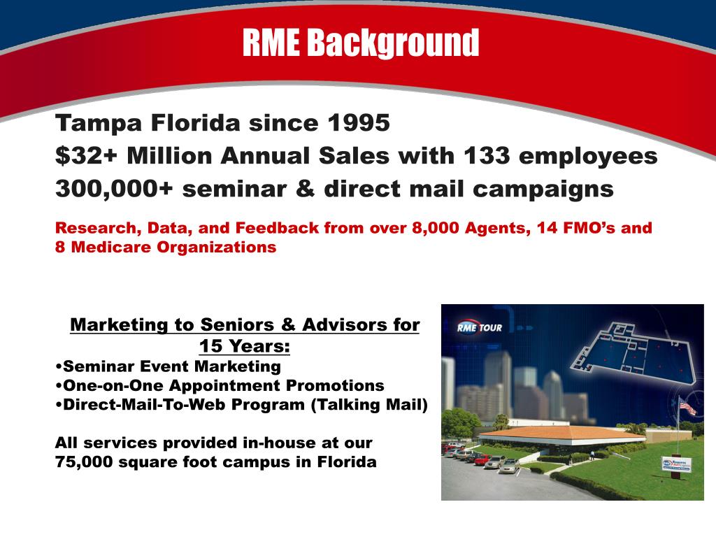 RME Background Tampa Florida since 1995 $32+ Million Annual Sales with 133 employees 300,000+ seminar & direct mail campaigns Research, Data, and Feedback from over 8,000 Agents, 14 FMO’s and 8 Medicare Organizations • Marketing to Seniors & Advisors for 15 Years: • Seminar Event Marketing • One-on-One Appointment Promotions • Direct-Mail-To-Web Program (Talking Mail) • All services provided in-house at our • 75,000 square foot campus in Florida