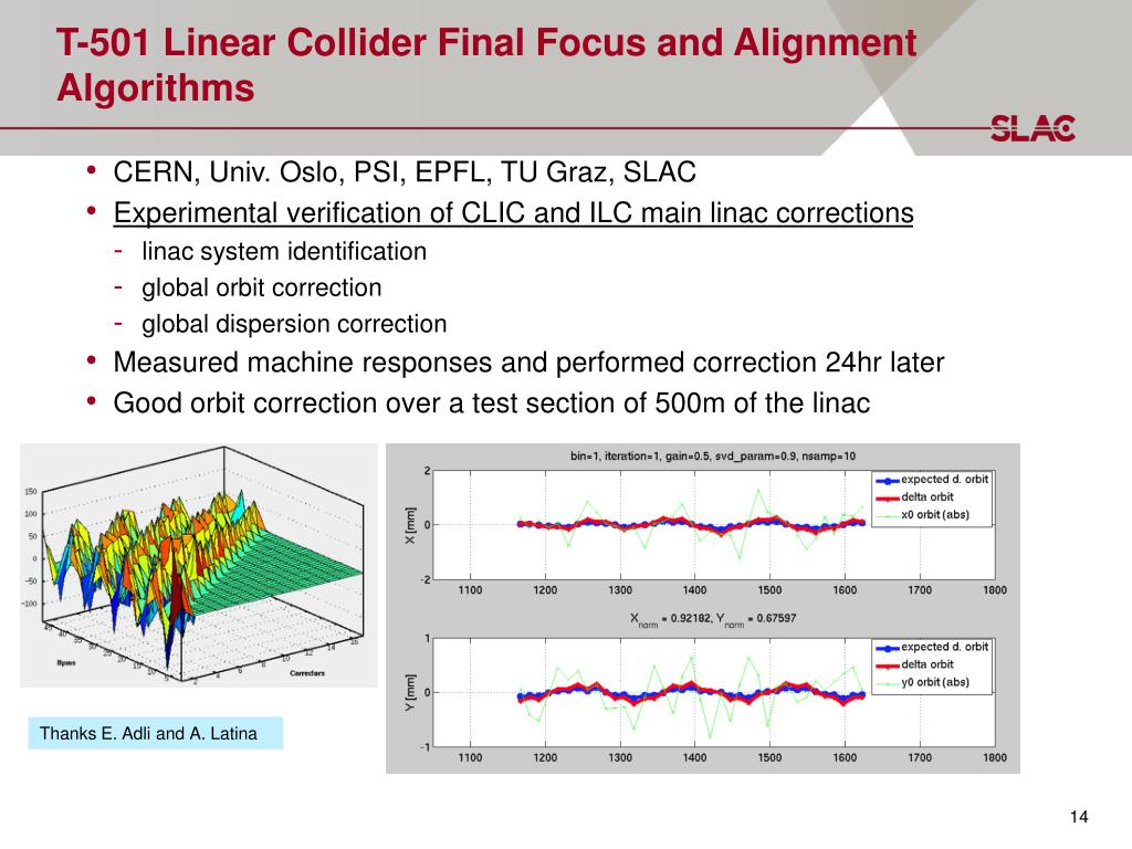 T-501 Linear Collider Final Focus and Alignment Algorithms • CERN, Univ. Oslo, PSI, EPFL, TU Graz, SLAC • Experimental verification of CLIC and ILC main linac corrections • linac system identification • global orbit correction • global dispersion correction • Measured machine responses and performed correction 24hr later • Good orbit correction over a test section of 500m of the linac Thanks E. Adli and A. Latina