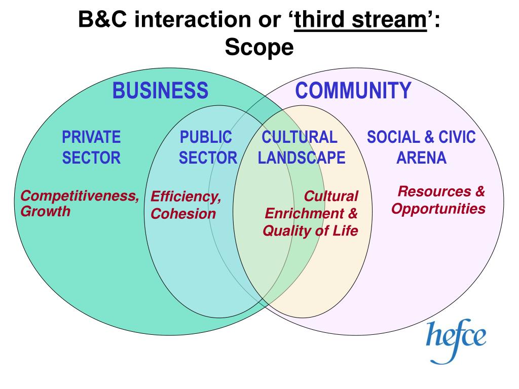 BUSINESS COMMUNITY PRIVATE SECTOR PUBLIC SECTOR CULTURAL LANDSCAPE SOCIAL & CIVIC ARENA Resources & Opportunities Cultural Enrichment & Quality of Life Efficiency,Cohesion Competitiveness, Growth B&C interaction or ‘third stream’: Scope