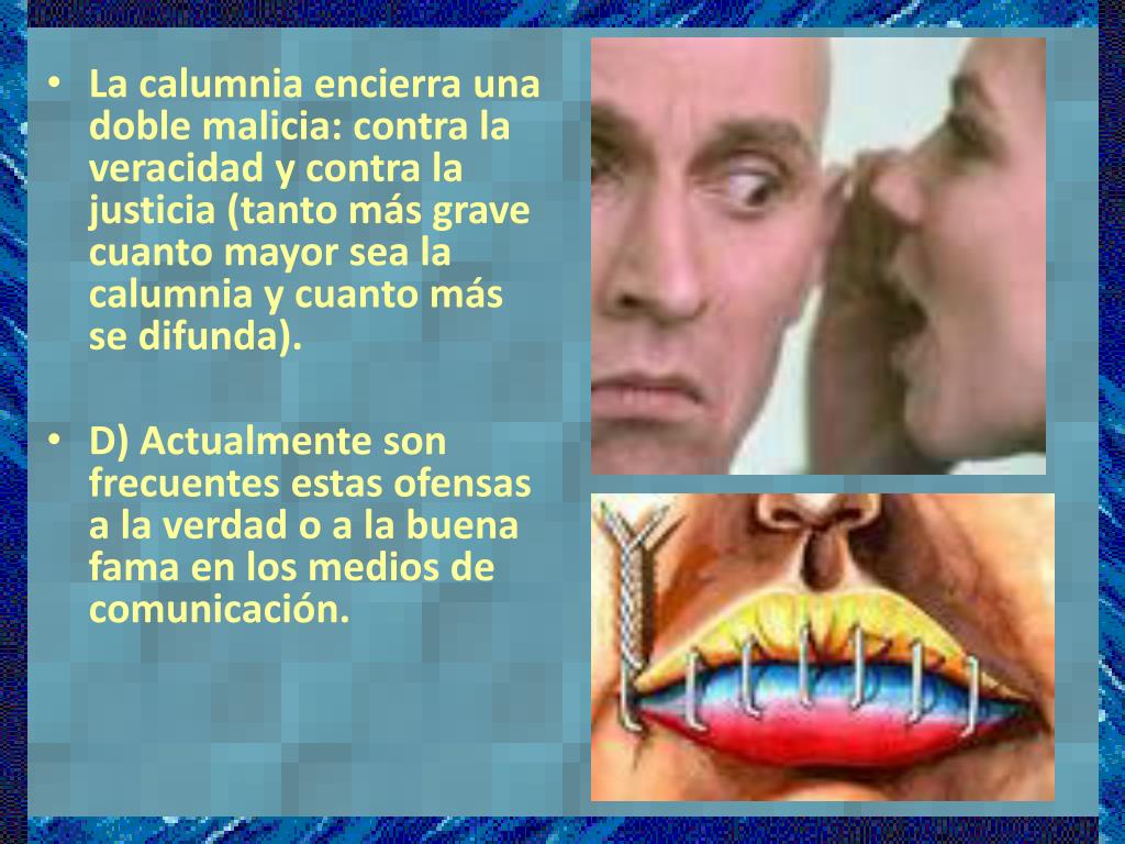 La calumnia encierra una doble malicia: contra la veracidad y contra la justicia (tanto más grave cuanto mayor sea la calumnia y cuanto más se difunda). • D) Actualmente son frecuentes estas ofensas a la verdad o a la buena fama en los medios de comunicación.