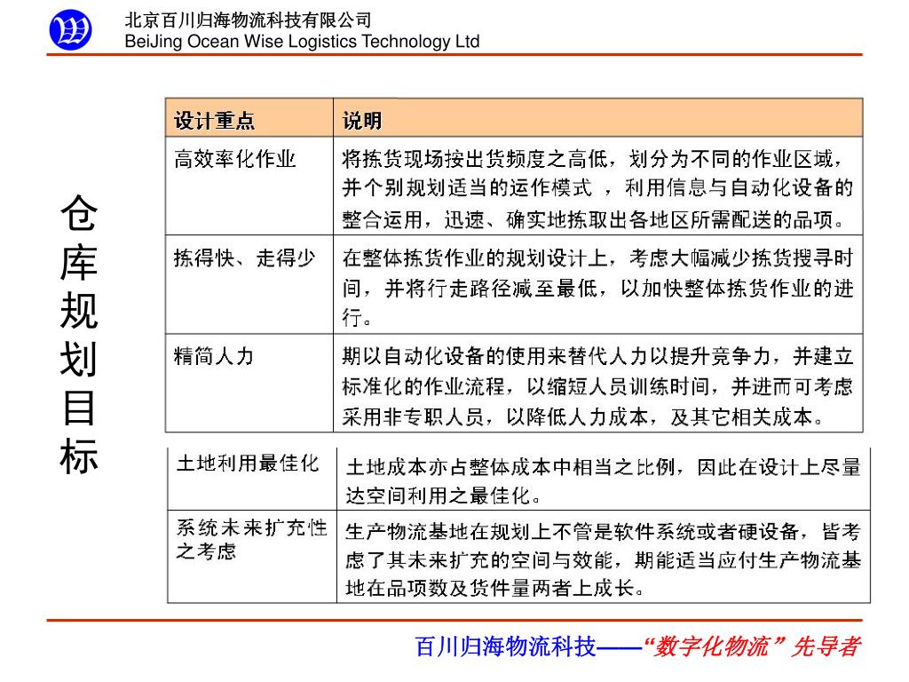 数字化仓储 规划. 主讲人:范翔 CEO 、管理咨询师. 北京百川归海物流科技有限公司 BeiJing Ocean Wise Logistics Technology Ltd. “ 数字化 ” 物流管理. 数字化!. 物流规划 —— 物流运营 —— 物流决策 —— 物流成本 ——. Digital Management. 数字化管理是指利用计算机、通信、网络等技术,通过统计技术量化管理对象与管理行为,实现研发、计划、组织、生产、协调、销售、服务、创新等职能的管理活动和方法。. 简单、客观、公平、速度快、无障碍. 人 工 输 入 变 量. 数 字