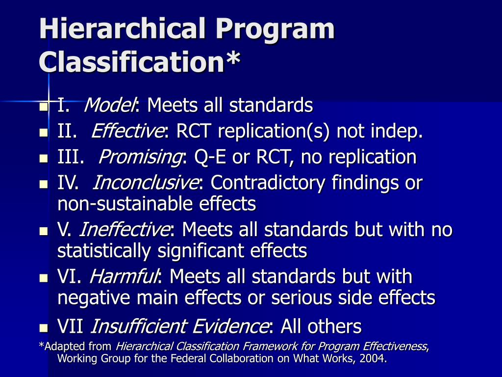 Hierarchical Program Classification* • I. Model: Meets all standards • II. Effective: RCT replication(s) not indep. • III. Promising: Q-E or RCT, no replication • IV. Inconclusive: Contradictory findings or non-sustainable effects • V. Ineffective: Meets all standards but with no statistically significant effects • VI. Harmful: Meets all standards but with negative main effects or serious side effects • VII Insufficient Evidence: All others *Adapted from Hierarchical Classification Framework for Program Effectiveness, Working Group for the Federal Collaboration on What Works, 2004.