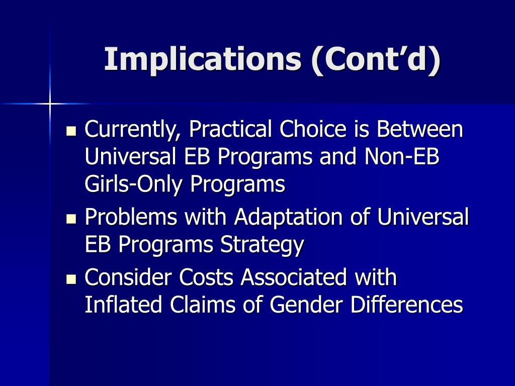 Implications (Cont’d) • Currently, Practical Choice is Between Universal EB Programs and Non-EB Girls-Only Programs • Problems with Adaptation of Universal EB Programs Strategy • Consider Costs Associated with Inflated Claims of Gender Differences