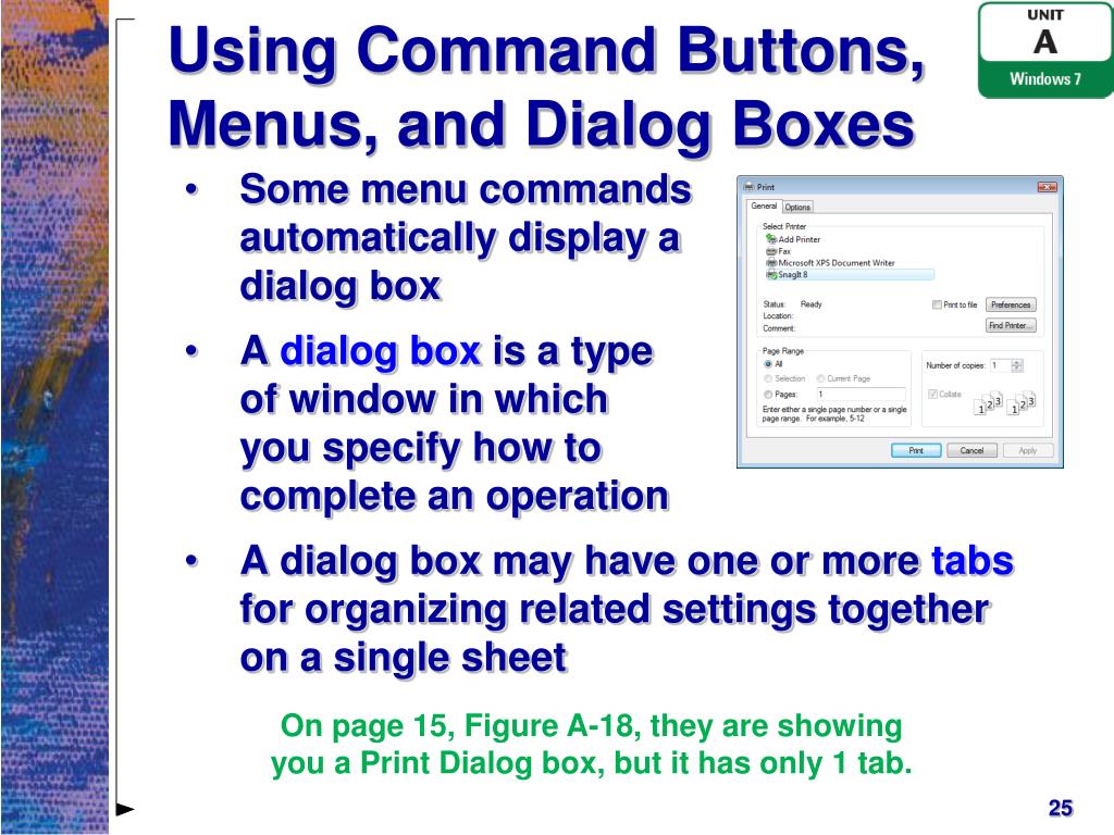 Using Command Buttons, Menus, and Dialog Boxes • Some menu commands automatically display a dialog box • A dialog box is a type of window in which you specify how to complete an operation • A dialog box may have one or more tabs for organizing related settings together on a single sheet On page 15, Figure A-18, they are showing you a Print Dialog box, but it has only 1 tab.