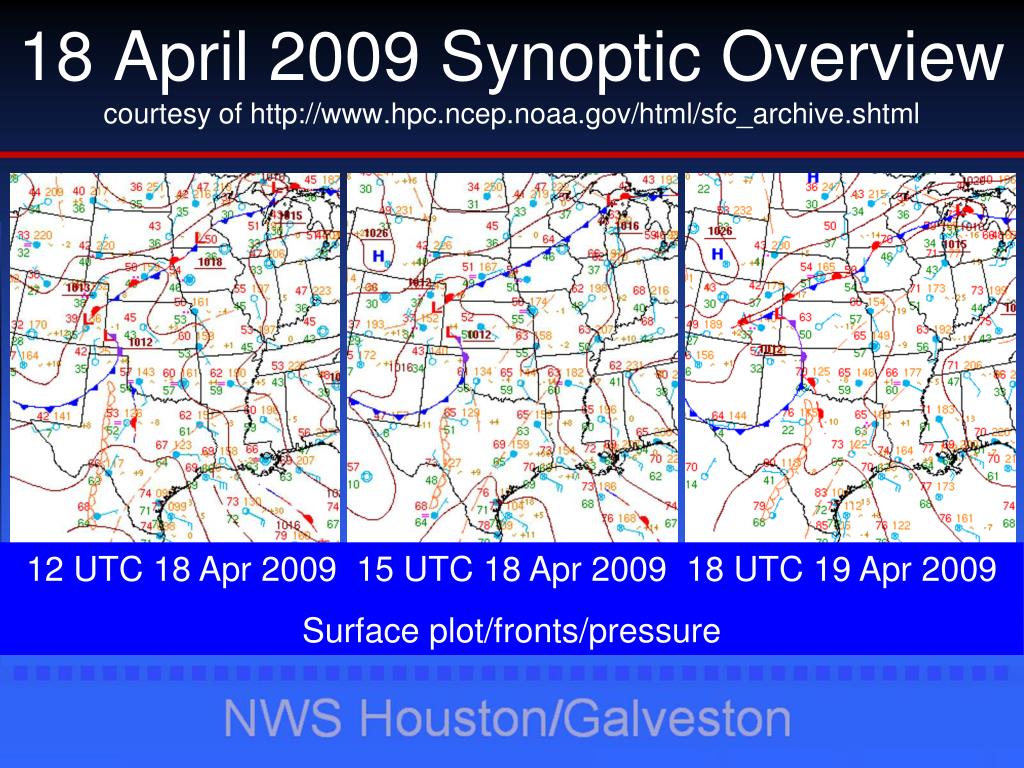 18 April 2009 Synoptic Overviewcourtesy of http://www.hpc.ncep.noaa.gov/html/sfc_archive.shtml 12 UTC 18 Apr 2009 15 UTC 18 Apr 2009 18 UTC 19 Apr 2009 Surface plot/fronts/pressure