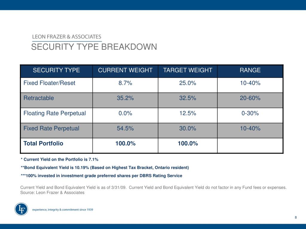 ABOUT THE FUND • Fund invests primarily in high quality preferred shares of major Canadian companies • Tax-advantaged dividend income • Current bond equivalent yield is 10.19% • Potential for capital gains • Diversification by credit, industry sector and security type • Benchmark: S&P/TSX Preferred Share Index • Inception: February 2009 Current Yield and Bond Equivalent Yield is as of 3/9/09. Current Yield and Bond Equivalent Yield do not factor in any Fund fees or expenses. Source: Leon Frazer & Associates