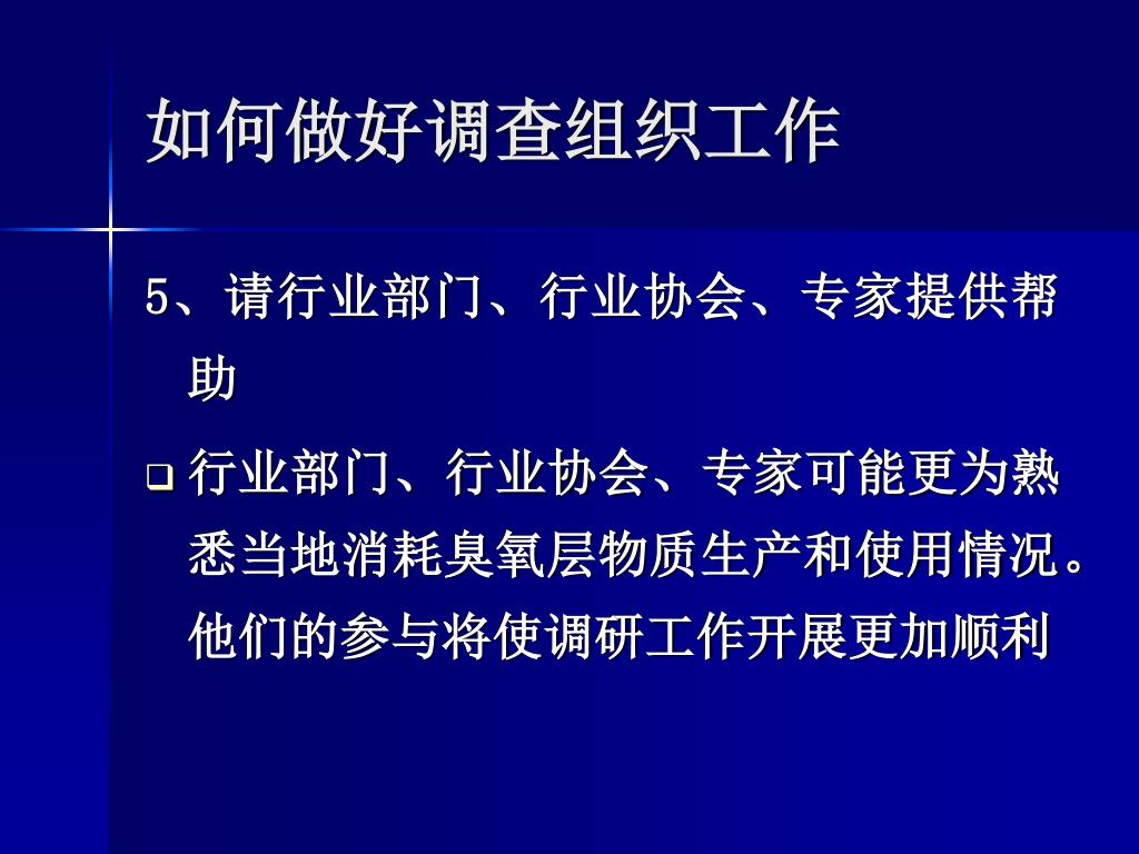 如何做好调查组织工作 5、请行业部门、行业协会、专家提供帮助 • 行业部门、行业协会、专家可能更为熟悉当地消耗臭氧层物质生产和使用情况。他们的参与将使调研工作开展更加顺利