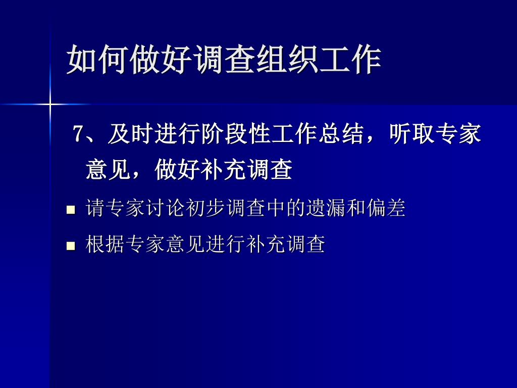 如何做好调查组织工作 7、及时进行阶段性工作总结,听取专家意见,做好补充调查 • 请专家讨论初步调查中的遗漏和偏差 • 根据专家意见进行补充调查