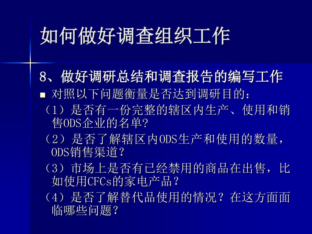 如何做好调查组织工作 8、做好调研总结和调查报告的编写工作 • 对照以下问题衡量是否达到调研目的: (1)是否有一份完整的辖区内生产、使用和销售ODS企业的名单? (2)是否了解辖区内ODS生产和使用的数量,ODS销售渠道? (3)市场上是否有已经禁用的商品在出售,比如使用CFCs的家电产品? (4)是否了解替代品使用的情况?在这方面面临哪些问题?