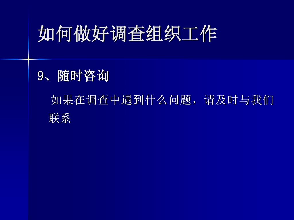 如何做好调查组织工作 9、随时咨询 如果在调查中遇到什么问题,请及时与我们联系