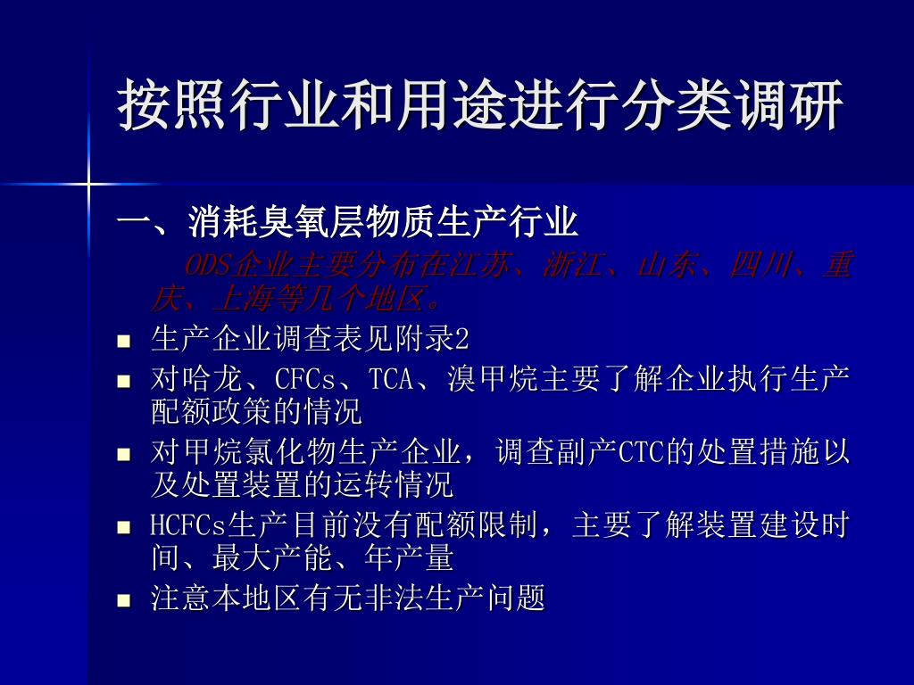 按照行业和用途进行分类调研 一、消耗臭氧层物质生产行业 ODS企业主要分布在江苏、浙江、山东、四川、重庆、上海等几个地区。 • 生产企业调查表见附录2 • 对哈龙、CFCs、TCA、溴甲烷主要了解企业执行生产配额政策的情况 • 对甲烷氯化物生产企业,调查副产CTC的处置措施以及处置装置的运转情况 • HCFCs生产目前没有配额限制,主要了解装置建设时间、最大产能、年产量 • 注意本地区有无非法生产问题