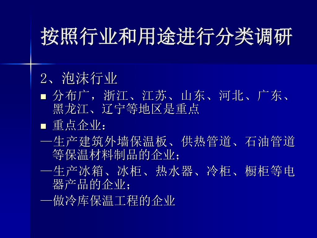 按照行业和用途进行分类调研 2、泡沫行业 • 分布广,浙江、江苏、山东、河北、广东、黑龙江、辽宁等地区是重点 • 重点企业: —生产建筑外墙保温板、供热管道、石油管道等保温材料制品的企业; —生产冰箱、冰柜、热水器、冷柜、橱柜等电器产品的企业; —做冷库保温工程的企业