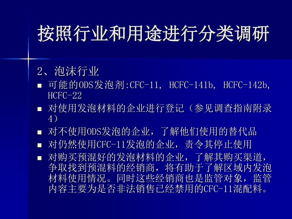 按照行业和用途进行分类调研 2、泡沫行业 • 可能的ODS发泡剂:CFC-11, HCFC-141b, HCFC-142b, HCFC-22 • 对使用发泡材料的企业进行登记(参见调查指南附录4) • 对不使用ODS发泡的企业,了解他们使用的替代品 • 对仍然使用CFC-11发泡的企业,责令其停止使用 • 对购买预混好的发泡材料的企业,了解其购买渠道,争取找到预混料的经销商,将有助于了解区域内发泡材料使用情况。同时这些经销商也是监管对象,监管内容主要为是否非法销售已经禁用的CFC-11混配料。