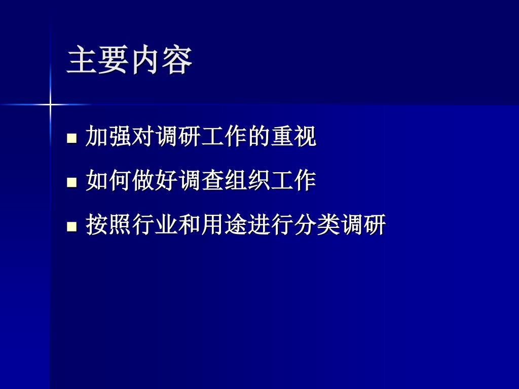 主要内容 • 加强对调研工作的重视 • 如何做好调查组织工作 • 按照行业和用途进行分类调研