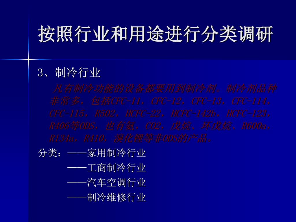 按照行业和用途进行分类调研 3、制冷行业 凡有制冷功能的设备都要用到制冷剂。制冷剂品种非常多,包括CFC-11,CFC-12,CFC-13,CFC-114,CFC-115,R502,HCFC-22,HCFC-142b,HCFC-123,R406等ODS,也有氨,CO2,戊烷、环戊烷、R600a,R134a,R410,溴化锂等非ODS的产品。 分类:——家用制冷行业 ——工商制冷行业 ——汽车空调行业 ——制冷维修行业