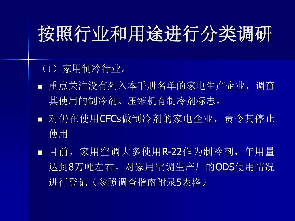 按照行业和用途进行分类调研 (1)家用制冷行业。 • 重点关注没有列入本手册名单的家电生产企业,调查其使用的制冷剂。压缩机有制冷剂标志。 • 对仍在使用CFCs做制冷剂的家电企业,责令其停止使用 • 目前,家用空调大多使用R-22作为制冷剂,年用量达到8万吨左右。对家用空调生产厂的ODS使用情况进行登记(参照调查指南附录5表格)