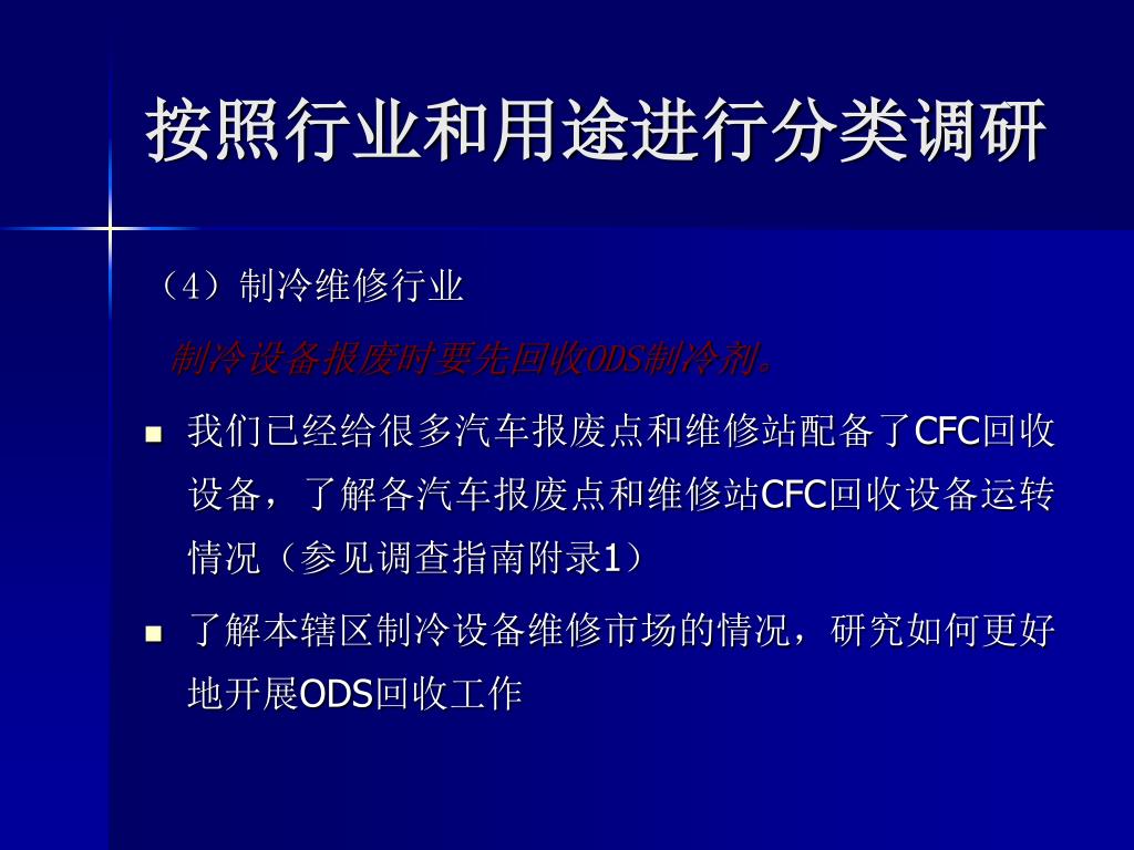 按照行业和用途进行分类调研 (4)制冷维修行业 制冷设备报废时要先回收ODS制冷剂。 • 我们已经给很多汽车报废点和维修站配备了CFC回收设备,了解各汽车报废点和维修站CFC回收设备运转情况(参见调查指南附录1) • 了解本辖区制冷设备维修市场的情况,研究如何更好地开展ODS回收工作
