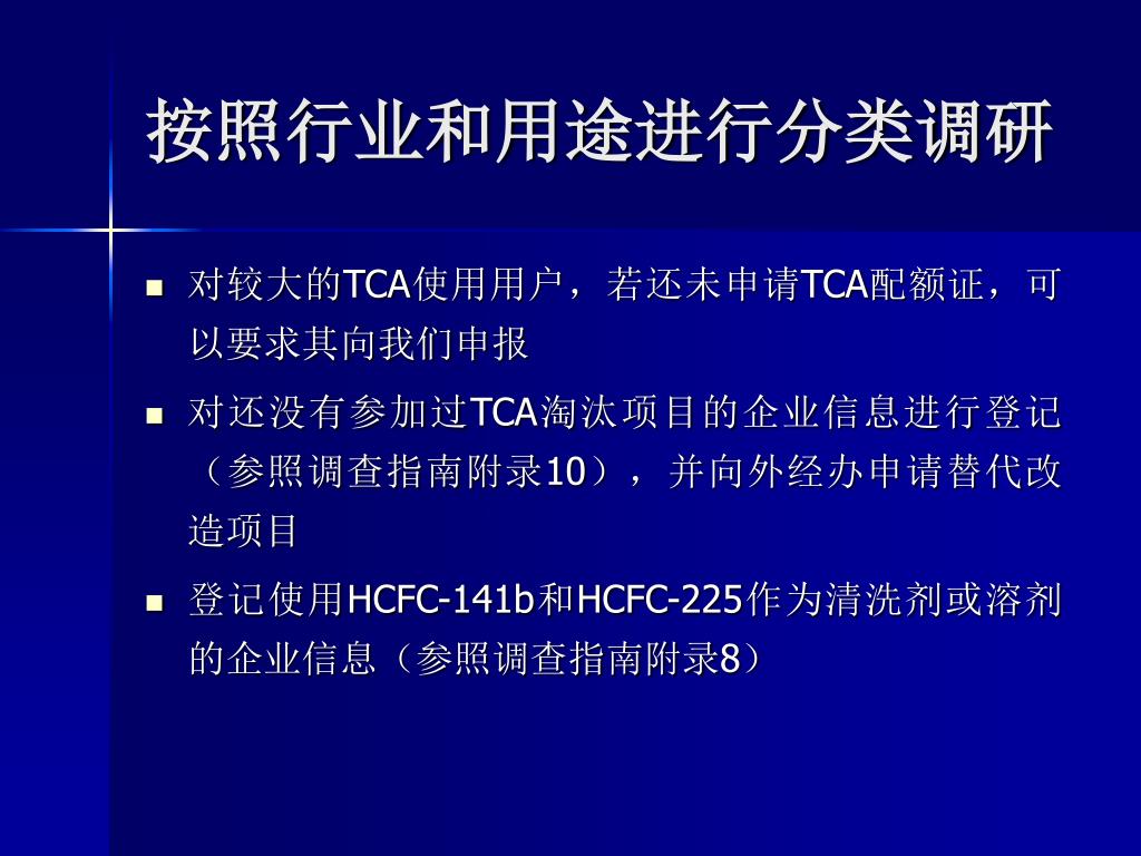 按照行业和用途进行分类调研 • 对较大的TCA使用用户,若还未申请TCA配额证,可以要求其向我们申报 • 对还没有参加过TCA淘汰项目的企业信息进行登记(参照调查指南附录10),并向外经办申请替代改造项目 • 登记使用HCFC-141b和HCFC-225作为清洗剂或溶剂的企业信息(参照调查指南附录8)