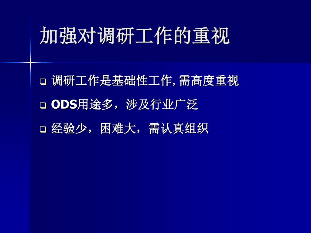 加强对调研工作的重视 • 调研工作是基础性工作,需高度重视 • ODS用途多,涉及行业广泛 • 经验少,困难大,需认真组织