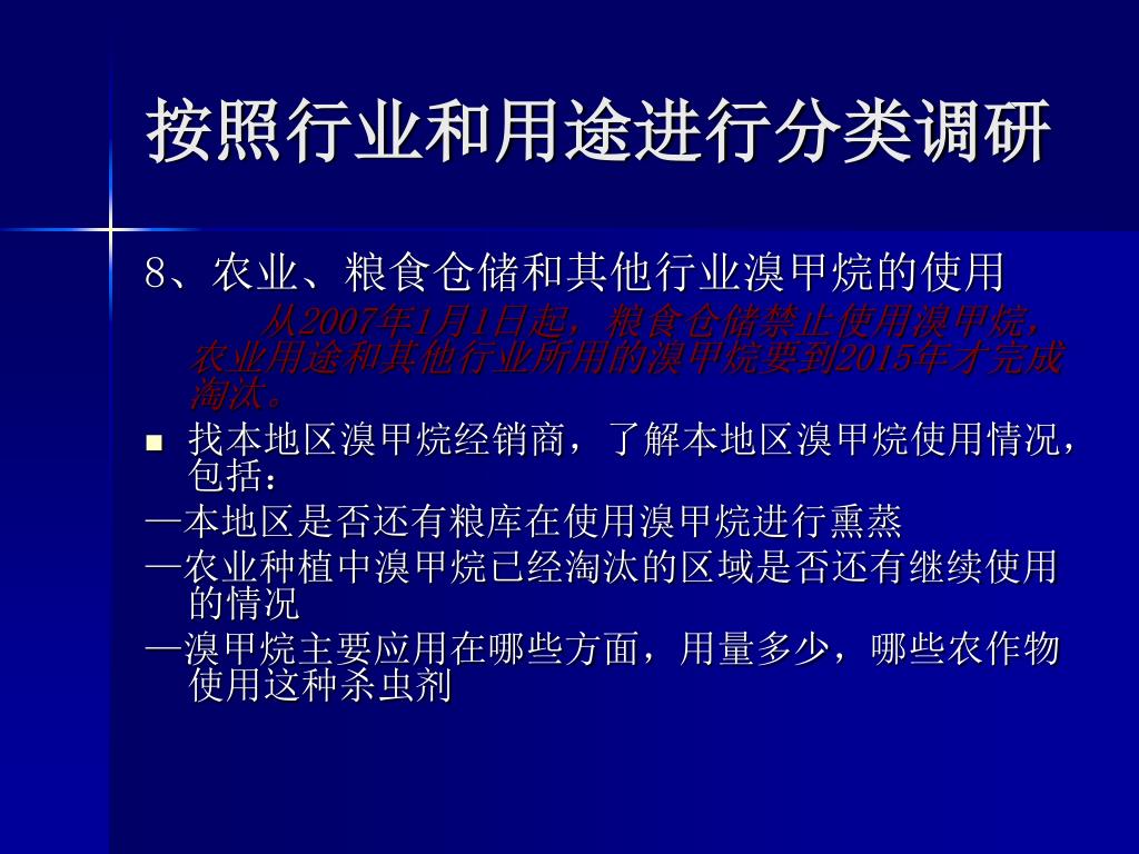 按照行业和用途进行分类调研 8、农业、粮食仓储和其他行业溴甲烷的使用 从2007年1月1日起,粮食仓储禁止使用溴甲烷,农业用途和其他行业所用的溴甲烷要到2015年才完成淘汰。 • 找本地区溴甲烷经销商,了解本地区溴甲烷使用情况,包括: —本地区是否还有粮库在使用溴甲烷进行熏蒸 —农业种植中溴甲烷已经淘汰的区域是否还有继续使用的情况 —溴甲烷主要应用在哪些方面,用量多少,哪些农作物使用这种杀虫剂