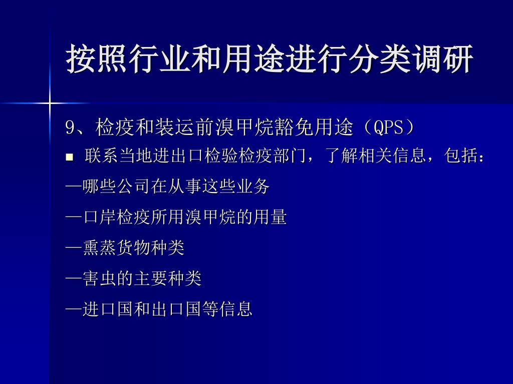 按照行业和用途进行分类调研 9、检疫和装运前溴甲烷豁免用途(QPS) • 联系当地进出口检验检疫部门,了解相关信息,包括: —哪些公司在从事这些业务 —口岸检疫所用溴甲烷的用量 —熏蒸货物种类 —害虫的主要种类 —进口国和出口国等信息
