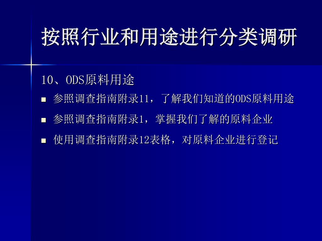 按照行业和用途进行分类调研 10、ODS原料用途 • 参照调查指南附录11,了解我们知道的ODS原料用途 • 参照调查指南附录1,掌握我们了解的原料企业 • 使用调查指南附录12表格,对原料企业进行登记