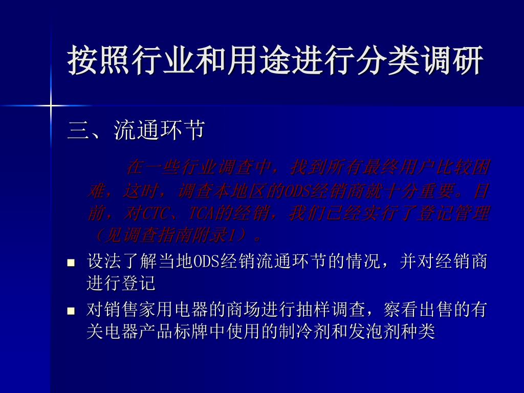 按照行业和用途进行分类调研 三、流通环节 在一些行业调查中,找到所有最终用户比较困难,这时,调查本地区的ODS经销商就十分重要。目前,对CTC、TCA的经销,我们已经实行了登记管理(见调查指南附录1)。 • 设法了解当地ODS经销流通环节的情况,并对经销商进行登记 • 对销售家用电器的商场进行抽样调查,察看出售的有关电器产品标牌中使用的制冷剂和发泡剂种类