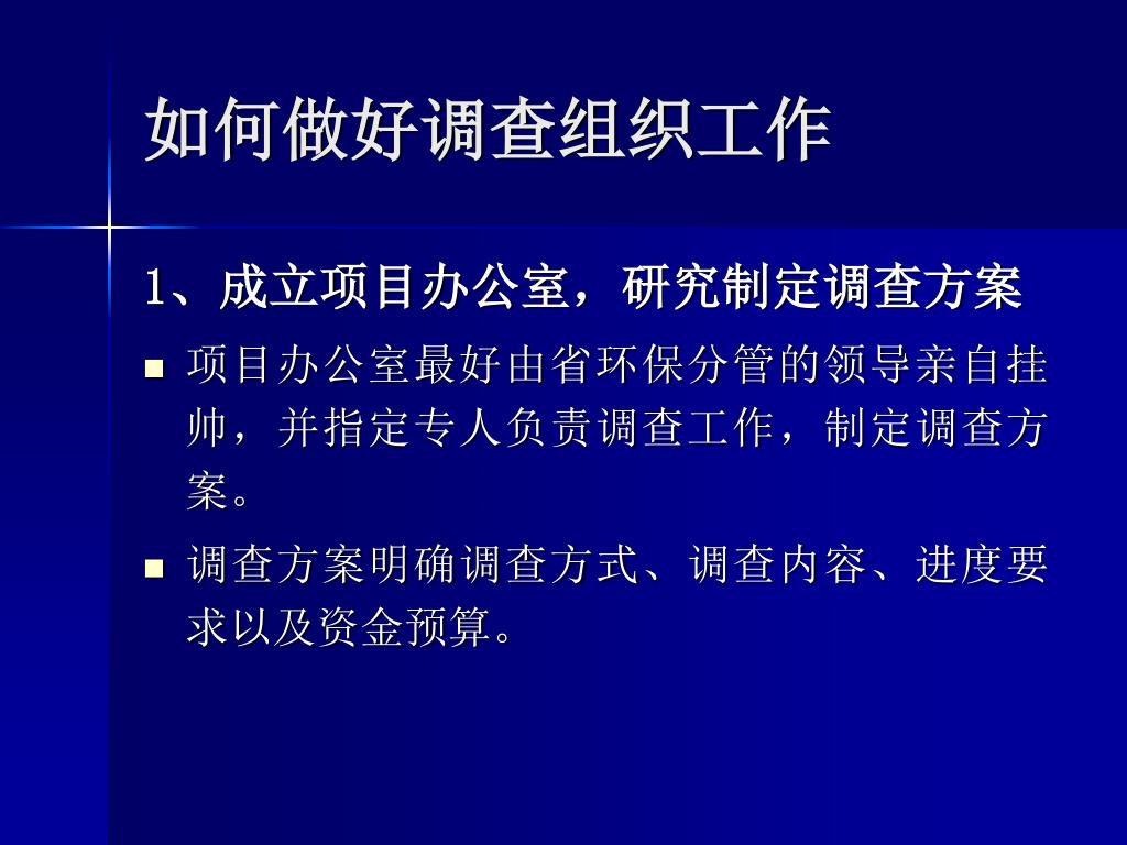 如何做好调查组织工作 1、成立项目办公室,研究制定调查方案 • 项目办公室最好由省环保分管的领导亲自挂帅,并指定专人负责调查工作,制定调查方案。 • 调查方案明确调查方式、调查内容、进度要求以及资金预算。