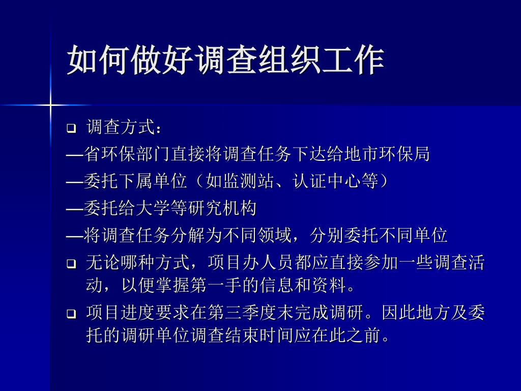 如何做好调查组织工作 • 调查方式: —省环保部门直接将调查任务下达给地市环保局 —委托下属单位(如监测站、认证中心等) —委托给大学等研究机构 —将调查任务分解为不同领域,分别委托不同单位 • 无论哪种方式,项目办人员都应直接参加一些调查活动,以便掌握第一手的信息和资料。 • 项目进度要求在第三季度末完成调研。因此地方及委托的调研单位调查结束时间应在此之前。