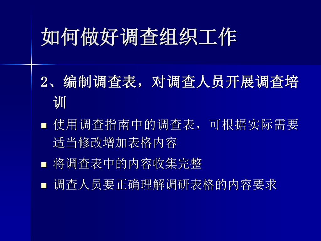 如何做好调查组织工作 2、编制调查表,对调查人员开展调查培训 • 使用调查指南中的调查表,可根据实际需要适当修改增加表格内容 • 将调查表中的内容收集完整 • 调查人员要正确理解调研表格的内容要求