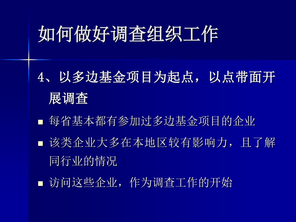 如何做好调查组织工作 • 制定调查方案 • 组织对调查人员的培训 • 从已经掌握的多边基金企业入手开展调查 • 注意工作进度