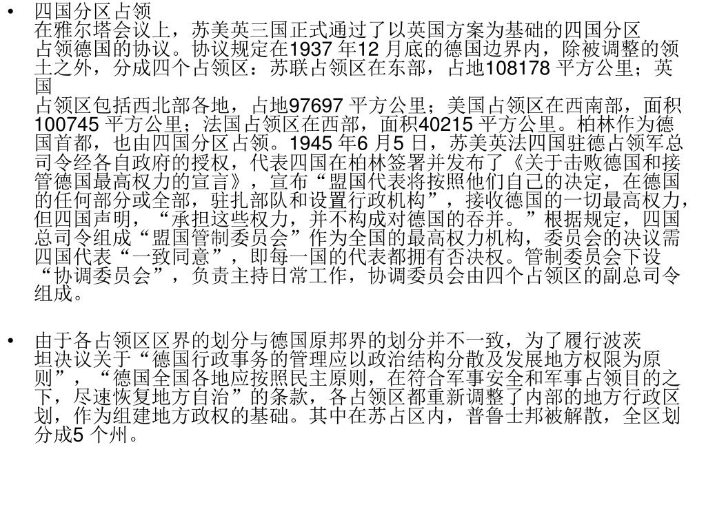 四国分区占领在雅尔塔会议上,苏美英三国正式通过了以英国方案为基础的四国分区占领德国的协议。协议规定在1937 年12 月底的德国边界内,除被调整的领土之外,分成四个占领区:苏联占领区在东部,占地108178 平方公里;英国占领区包括西北部各地,占地97697 平方公里;美国占领区在西南部,面积100745 平方公里;法国占领区在西部,面积40215 平方公里。柏林作为德国首都,也由四国分区占领。1945 年6 月5 日,苏美英法四国驻德占领军总司令经各自政府的授权,代表四国在柏林签署并发布了《关于击败德国和接管德国最高权力的宣言》,宣布“盟国代表将按照他们自己的决定,在德国的任何部分或全部,驻扎部队和设置行政机构”,接收德国的一切最高权力,但四国声明,“承担这些权力,并不构成对德国的吞并。”根据规定,四国总司令组成“盟国管制委员会”作为全国的最高权力机构,委员会的决议需四国代表“一致同意”,即每一国的代表都拥有否决权。管制委员会下设“协调委员会”,负责主持日常工作,协调委员会由四个占领区的副总司令组成。 • 由于各占领区区界的划分与德国原邦界的划分并不一致,为了履行波茨坦决议关于“德国行政事务的管理应以政治结构分散及发展地方权限为原则”,“德国全国各地应按照民主原则,在符合军事安全和军事占领目的之下,尽速恢复地方自治”的条款,各占领区都重新调整了内部的地方行政区划,作为组建地方政权的基础。其中在苏占区内,普鲁士邦被解散,全区划分成5 个州。