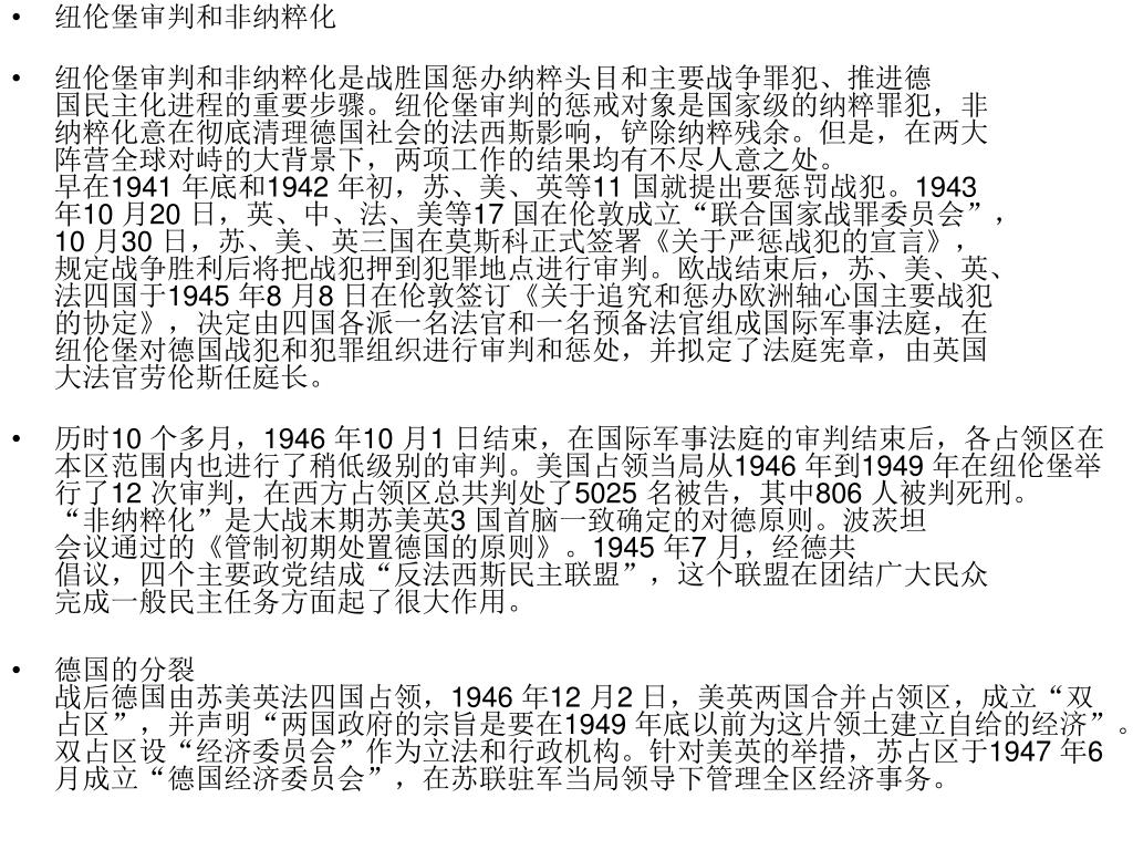纽伦堡审判和非纳粹化 • 纽伦堡审判和非纳粹化是战胜国惩办纳粹头目和主要战争罪犯、推进德国民主化进程的重要步骤。纽伦堡审判的惩戒对象是国家级的纳粹罪犯,非纳粹化意在彻底清理德国社会的法西斯影响,铲除纳粹残余。但是,在两大阵营全球对峙的大背景下,两项工作的结果均有不尽人意之处。早在1941 年底和1942 年初,苏、美、英等11 国就提出要惩罚战犯。1943年10 月20 日,英、中、法、美等17 国在伦敦成立“联合国家战罪委员会”,10 月30 日,苏、美、英三国在莫斯科正式签署《关于严惩战犯的宣言》,规定战争胜利后将把战犯押到犯罪地点进行审判。欧战结束后,苏、美、英、法四国于1945 年8 月8 日在伦敦签订《关于追究和惩办欧洲轴心国主要战犯的协定》,决定由四国各派一名法官和一名预备法官组成国际军事法庭,在纽伦堡对德国战犯和犯罪组织进行审判和惩处,并拟定了法庭宪章,由英国大法官劳伦斯任庭长。 • 历时10 个多月,1946 年10 月1 日结束,在国际军事法庭的审判结束后,各占领区在本区范围内也进行了稍低级别的审判。美国占领当局从1946 年到1949 年在纽伦堡举行了12 次审判,在西方占领区总共判处了5025 名被告,其中806 人被判死刑。“非纳粹化”是大战末期苏美英3 国首脑一致确定的对德原则。波茨坦会议通过的《管制初期处置德国的原则》。1945 年7 月,经德共倡议,四个主要政党结成“反法西斯民主联盟”,这个联盟在团结广大民众完成一般民主任务方面起了很大作用。 • 德国的分裂战后德国由苏美英法四国占领,1946 年12 月2 日,美英两国合并占领区,成立“双占区”,并声明“两国政府的宗旨是要在1949 年底以前为这片领土建立自给的经济”。双占区设“经济委员会”作为立法和行政机构。针对美英的举措,苏占区于1947 年6月成立“德国经济委员会”,在苏联驻军当局领导下管理全区经济事务。
