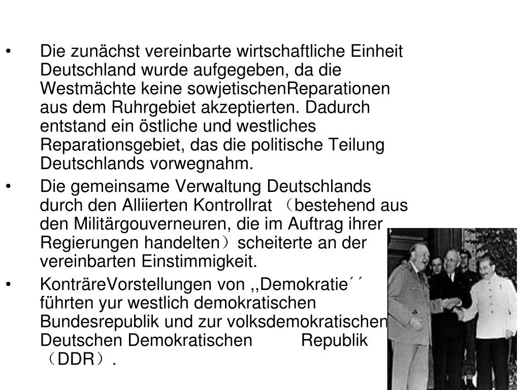 Die zunächst vereinbarte wirtschaftliche Einheit Deutschland wurde aufgegeben, da die Westmächte keine sowjetischenReparationen aus dem Ruhrgebiet akzeptierten. Dadurch entstand ein östliche und westliches Reparationsgebiet, das die politische Teilung Deutschlands vorwegnahm. • Die gemeinsame Verwaltung Deutschlands durch den Alliierten Kontrollrat (bestehend aus den Militärgouverneuren, die im Auftrag ihrer Regierungen handelten)scheiterte an der vereinbarten Einstimmigkeit. • KonträreVorstellungen von ,,Demokratie´´ führten yur westlich demokratischen Bundesrepublik und zur volksdemokratischen Deutschen Demokratischen Republik(DDR).