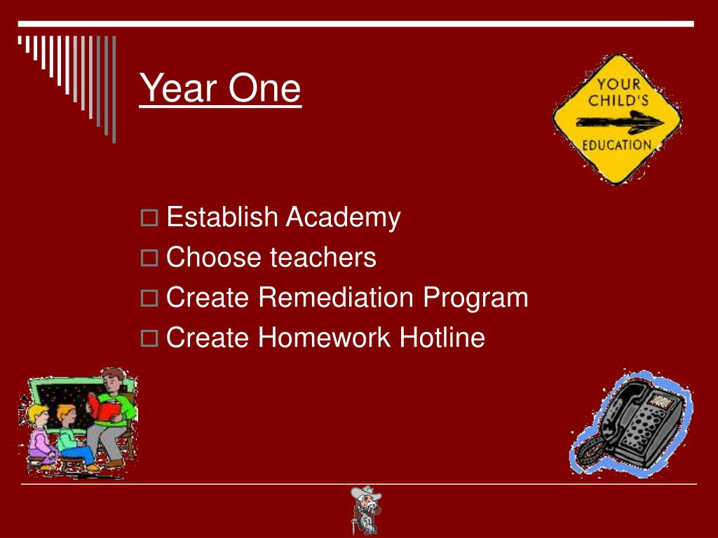Year One • Establish Academy • Choose teachers • Create Remediation Program • Create Homework Hotline