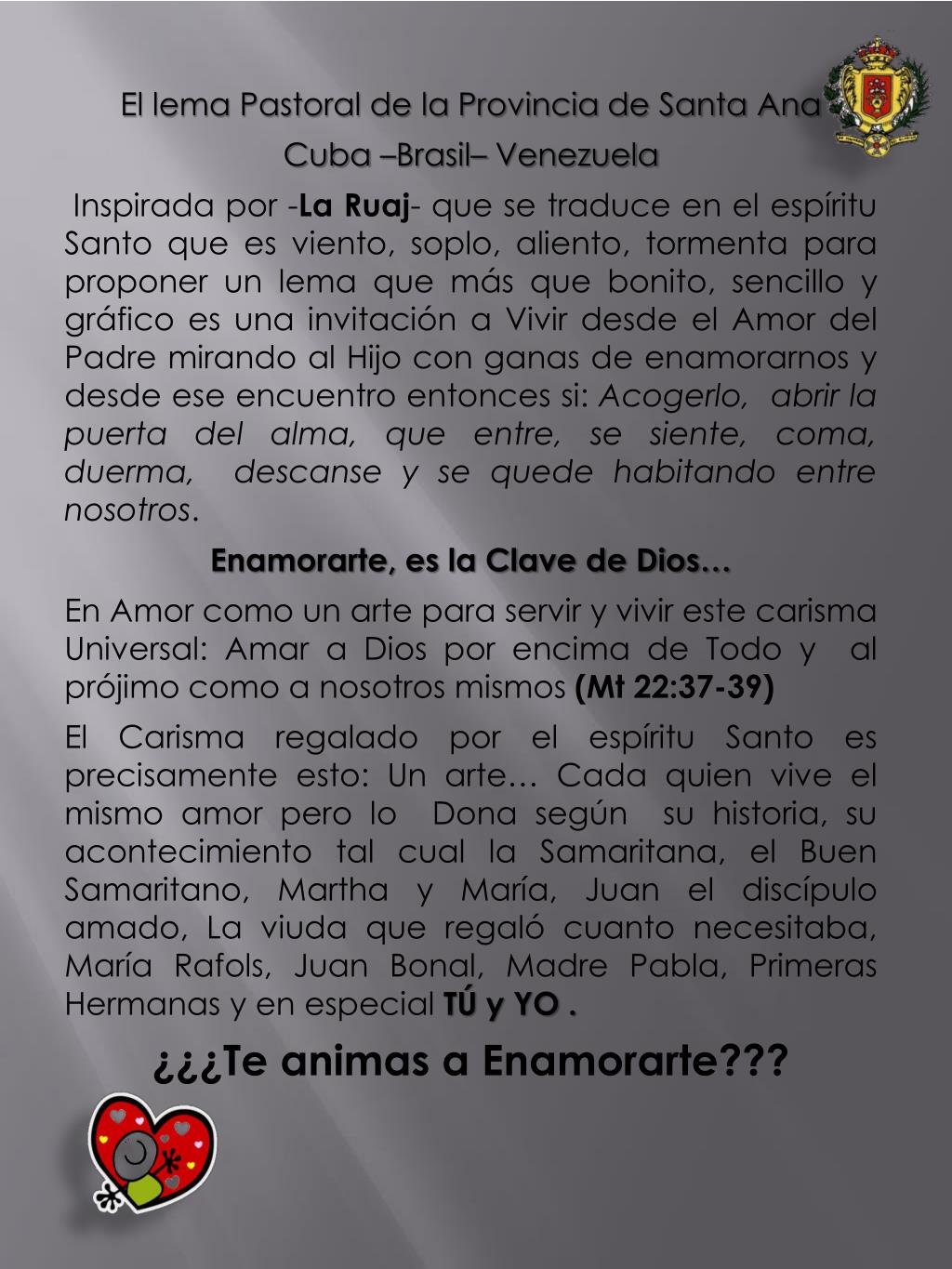 El lema Pastoral de la Provincia de Santa Ana Cuba –Brasil– Venezuela Inspirada por -La Ruaj- que se traduce en el espíritu Santo que es viento, soplo, aliento, tormenta para proponer un lema que más que bonito, sencillo y gráfico es una invitación aVivir desde el Amor del Padre mirando al Hijo con ganas de enamorarnos y desde ese encuentro entonces si: Acogerlo, abrir la puerta del alma, que entre, se siente, coma, duerma, descanse y se quede habitando entre nosotros. Enamorarte, es la Clave de Dios… En Amor como un arte para servir y vivir este carisma Universal: Amar a Dios por encima de Todo y al prójimo como a nosotros mismos (Mt 22:37-39) El Carisma regalado por el espíritu Santo es precisamente esto: Un arte… Cada quien vive el mismo amor pero lo Dona según su historia, su acontecimiento tal cual la Samaritana, el Buen Samaritano, Martha y María, Juan el discípulo amado, La viuda que regaló cuanto necesitaba, María Rafols, Juan Bonal, Madre Pabla, Primeras Hermanas y en especial TÚ y YO . ¿¿¿Te animas a Enamorarte???