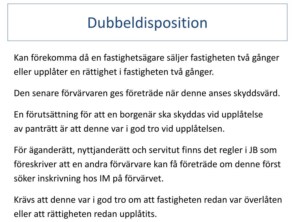 Dubbeldisposition Kan förekomma då en fastighetsägare säljer fastigheten två gånger eller upplåter en rättighet i fastigheten två gånger. Den senare förvärvaren ges företräde när denne anses skyddsvärd. En förutsättning för att en borgenär ska skyddas vid upplåtelse av panträtt är att denne var i god tro vid upplåtelsen. För äganderätt, nyttjanderätt och servitut finns det regler i JB som föreskriver att en andra förvärvare kan få företräde om denne först söker inskrivning hos IM på förvärvet. Krävs att denne var i god tro om att fastigheten redan var överlåten eller att rättigheten redan upplåtits.