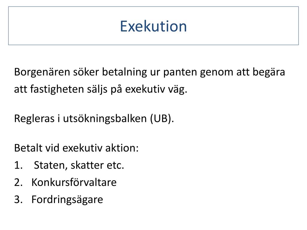 Exekution • Borgenärensökerbetalningurpantengenomattbegära • attfastighetensäljspåexekutivväg. • Reglerasiutsökningsbalken (UB). • Betalt vid exekutiv aktion: • Staten, skatter etc. • Konkursförvaltare • Fordringsägare